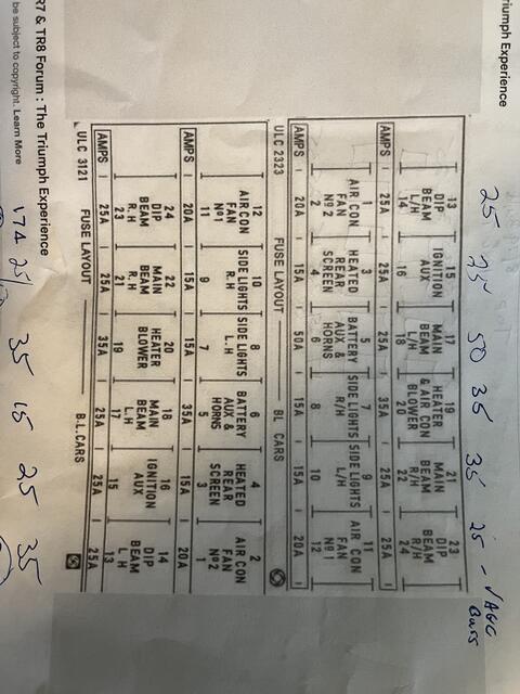Your Aug 1979 vehicle is likely a 1980 model year (what does the door plate say?), so don't start asking for 1979 fuse layout because there is a DIFFERENT and earlier fuse layout for the TR8 Coupes. They are "different" for sure, and I know because I own one. LaVerne has explained it well, and what you showed is a correct Lucas 50amp fuse, and the hand-written numbers you provided show that MOST of those numbers match what Triumph wants installed. Most vendors like Moss, TRF, TWS Motors, TS Imported and then the UK ones like Rimmer, S&S Prep and Robsport can provide the correct fuses for you.