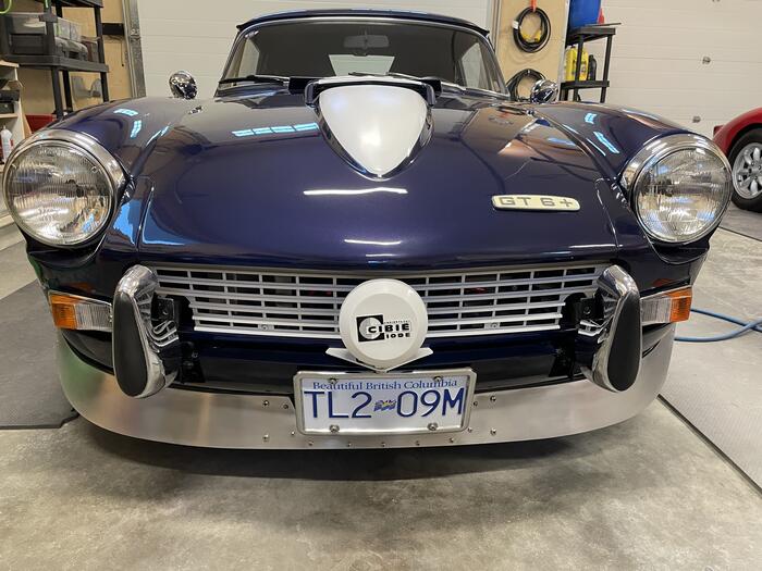 I like symmetry, however the central position of the original front number plate was blocking the duct work to the oil cooler. So I set about making a side mounted bracket from one of the bumper horns to support the offset number plate location. The new location is better functionally but I do not think so aesthetically pleasing.