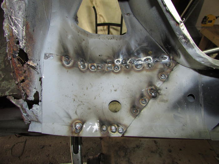 I got the flanged hole made and the patch inserted into place. Everything lined up well so it was time to start welding. Plug welds across the top, side and along the bottom. the overlapped flange seemed to work ok. I think in this case it was easier than a butt weld. I'm not too worried about the strength of the joint, I got good penetration and where I didn't I was able to get it from the other side.
