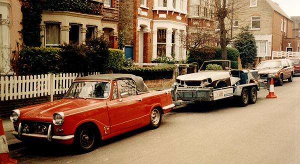 6th March 1988: 150,294, 43,850, 7,372: That's 7,372 careful miles on engine! Brought 1970 Vitesse Mk.2 Saloon chassis, no.4, home from Bill Swan's Twickenham lock-up garage, using SRK 617F (Herald 1200 Estate) and Bob's trailer to my newly rented lock-up garage in Wimbledon.