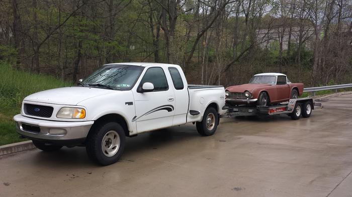 Car was partially disassembled in 1976 to be painted blue. It sat in a garage for 39 years until it was sold to a guy in Pittsburgh, PA. He had it for a few months and decided to sell, at which point I bought it off of eBay. I was looking for a TR4 but was not ready to buy, but this car came up for sale and it has a supposedly original aluminum surrey top and was within 4 hours of my house. I bought it the day after it was listed for sale. I towed it home and had to find a place to keep it. My brother sells industrial air compressors, so I could not take up any floor space in the garage at our commercial property. So we actually built a pallett for it and lifted it up into my lumber rack with a forklift. So at the moment it sits 10 feet off the ground where I plan to get it running, then bring it down. I am hoping to make a bit of a resto-mod. I am not going to do anything that isn't easily reversible. I will keep the engine and trans to go back in in the future. I would like to replace the engine and transmission with the driveline out of either a 2.3 EcoBoost Mustang or a 2.0 Ecotec from a Pontiac Solstice GXP/Saturn Sky Redline. This will be way more horsepower, but more importantly should deliver around 35-40 mpg! I plan on leaving the suspension and brakes stock, if at all possible. I would rather keep everything period correct, but I can't pass up the power, reliability and efficiency of a new engine. I want this to be my ideal vehicle, a luxury sports car. A poor man's Aston Martin. I plan to do the interior in leather and wood myself. I went to school for woodworking and am teaching myself to do upholstery. I have some cool ideas I think most fellow Triumph guys are gonna love. I'd like to some day use it to pull my 1956 14' FeatherCraft Vagabond II boat (the boat and trailer only weigh 500lbs, I can pull it uphill by hand with no effort, so I am sure it won't be a problem to tow). As you can tell I am very excited. Once I get about a million things for my home and business done I am gonna start working on it. My goal is to get it on the road with it's stock drivetrain and work slowly on it while driving it until it's what I want. Hopefully it will be driving in Oct 2017 to go to the Hershey AACA show in it. Glad to be in the Triumph Community and look forward to getting to know some of you.